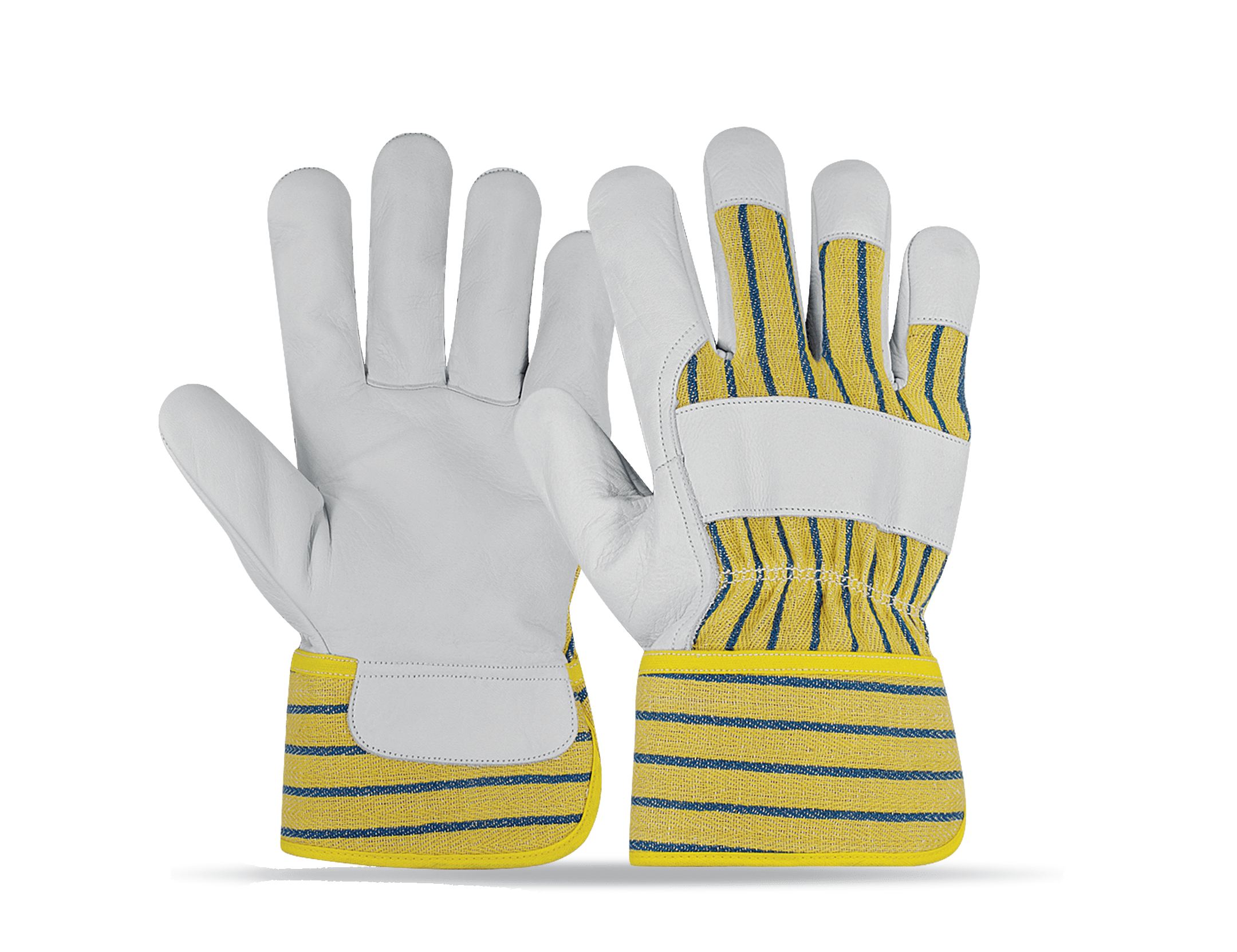 Leather: Cow grain leather Colour: Natural Thumb: Wing thumb Material: Cotton drill back and rubberize Additional Cuff: Inside half fleece lining shirred elastic inside back Additional: Index finger three fingers tip Knuckle protection on back Size: 8, 9, 10, 11