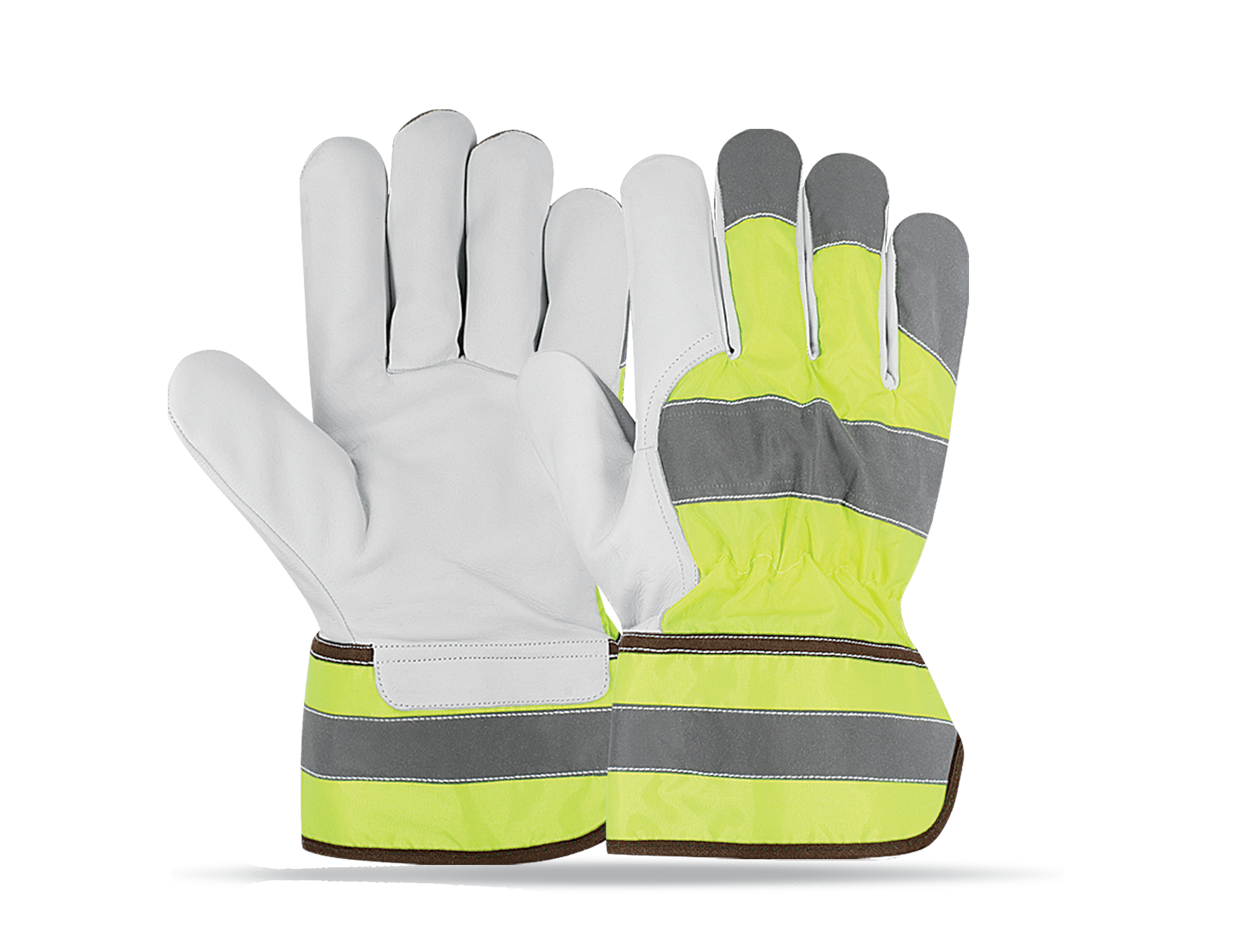 Leather: Goatskin leather Colour: Natural Thumb: Wing thumb Material: Hi-viz material back and cuff Additional: Inside full fleece lining shirred elastic inside back Index finger three fingers tip reflective strap at finger, knuckle and cuff Size: 8, 9, 10, 11