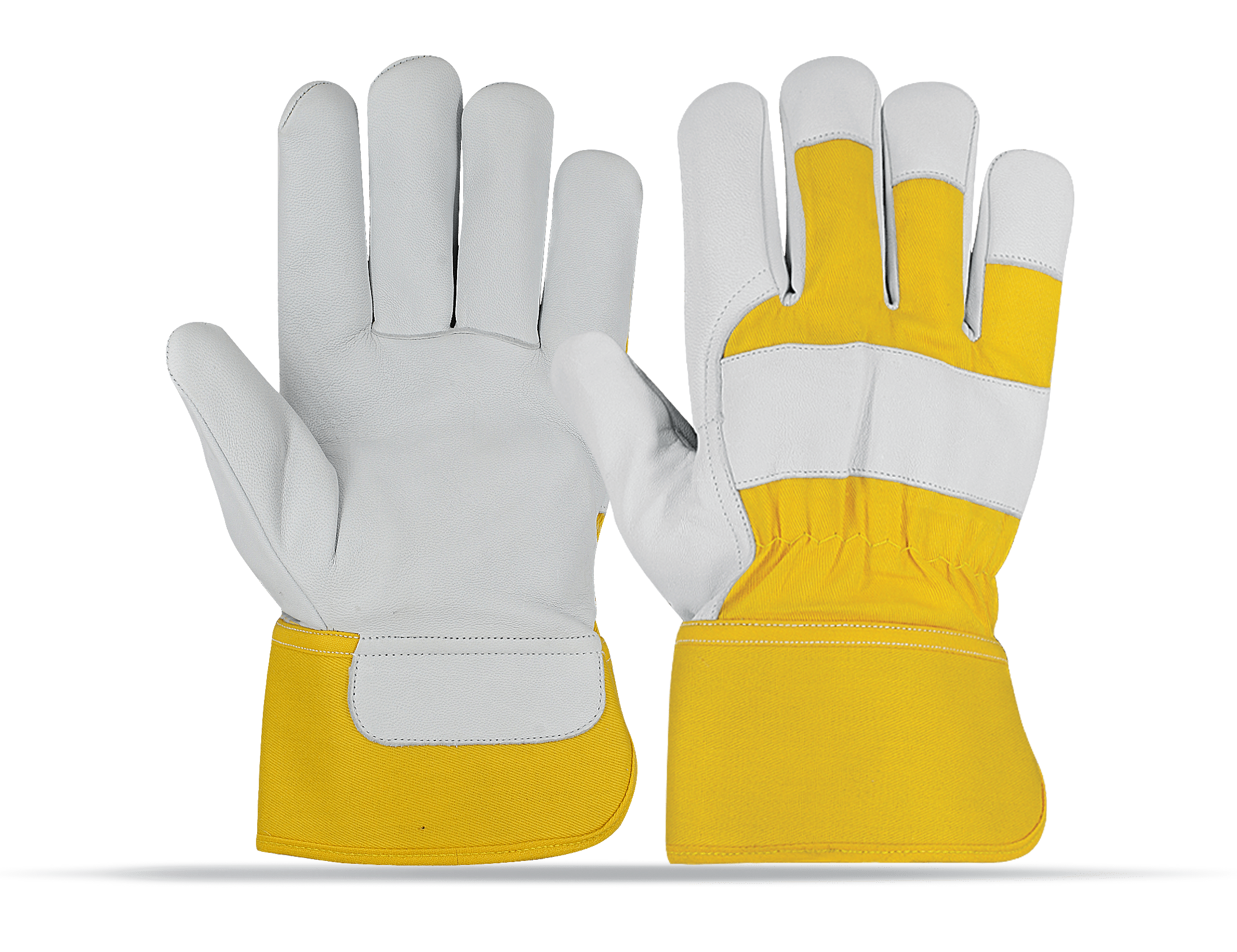 Leather: Goatskin leather Colour: Natural Thumb: Wing thumb Material: Cotton drill back and rubberize Additional Cuff: Inside half fleece lining shirred elastic inside back Additional: Index finger three fingers tip Knuckle protection on back
